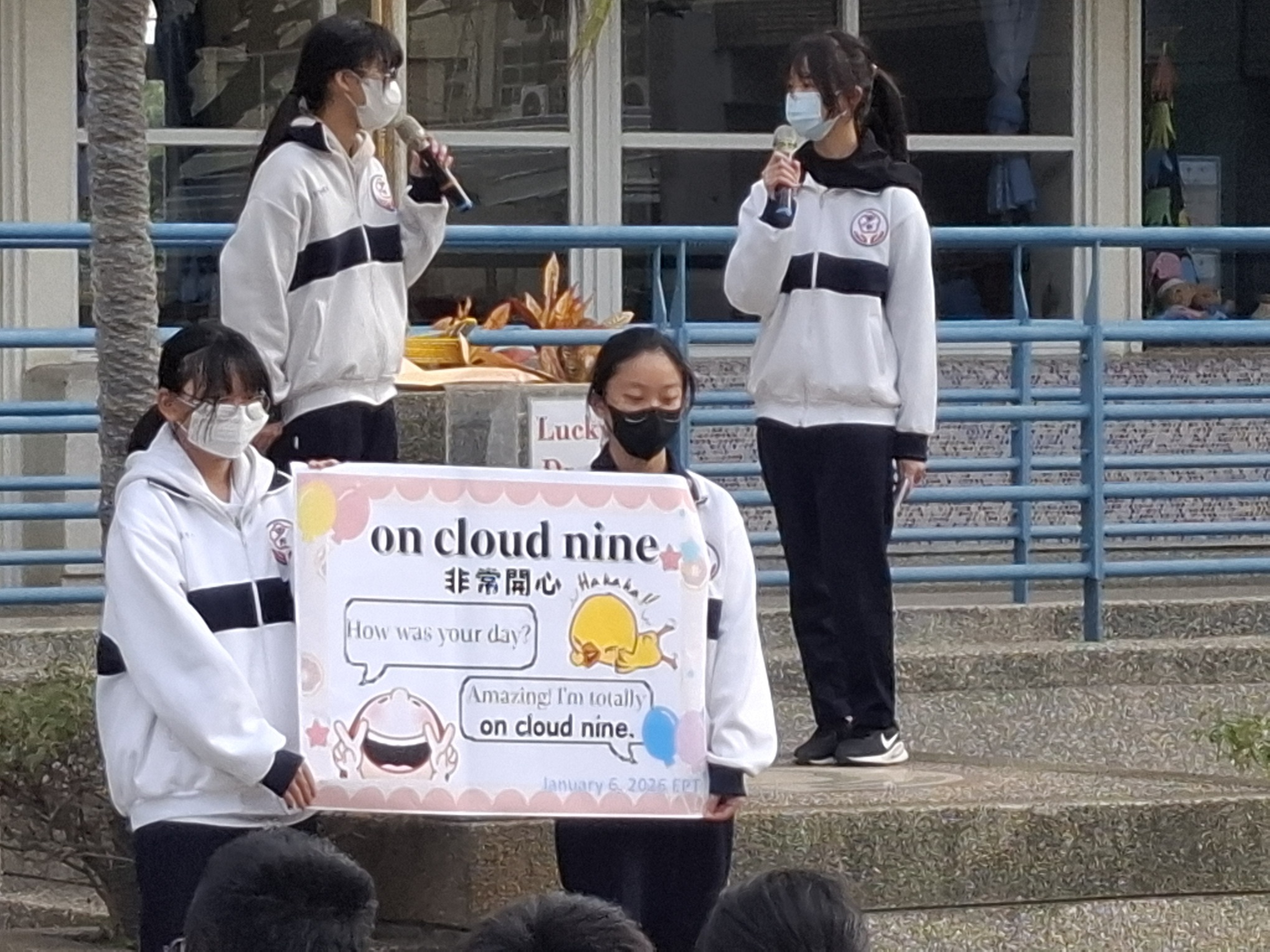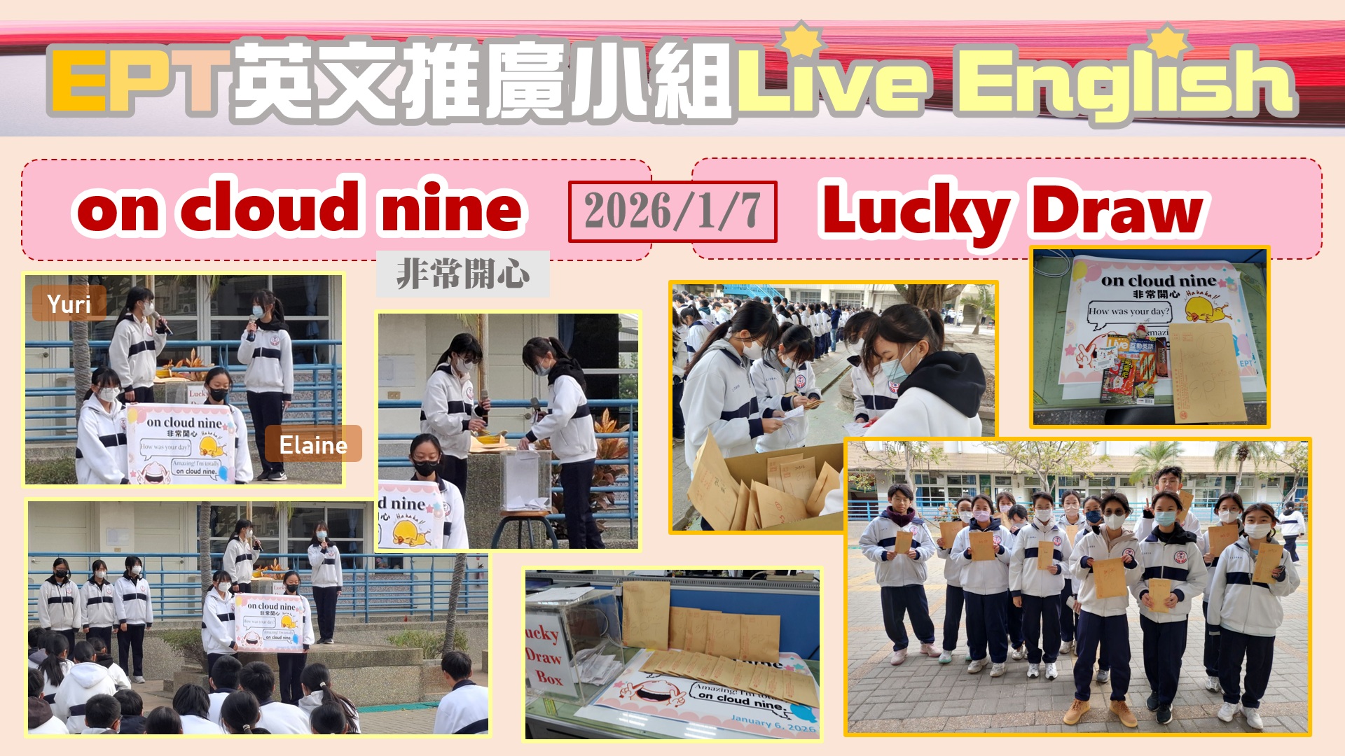 EPT英文推廣小組Live English 2026/1/7「on cloud nine」非常開心 801王宥云Yuri、林沂霈Elaine 指導教師:粘惠鈞老師Mina 期末總結進行抽獎活動Lucky Draw