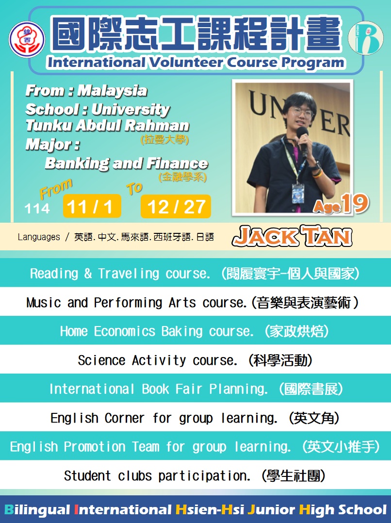 國際志工陳展宏 (Tan Zhan Hong) 馬來西亞,新山 (Johor Bahru, Malaysia)人19 歲 目前就讀於拉曼大學(UTAR)的基礎課程 對全球交流與文化交換充滿熱情 在校協同教學期間為114年11/1-12/27