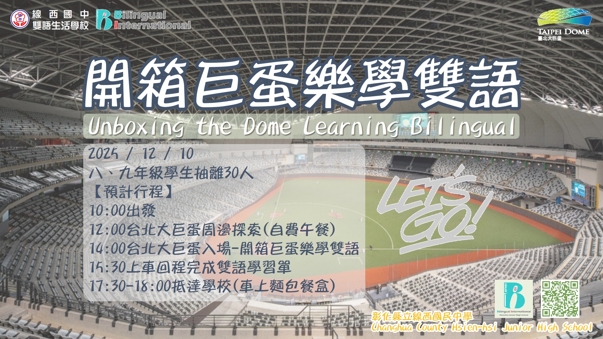 落實雙語生活學校理念: 實踐「線西國中雙語生活學校」的願景,將雙語教學融入校外教學與日常生活情境。 建立特色校本課程: 開發與國際級場館結合的特色校外教學活動,豐富教學資源與課程多元性。 提升學校能見度與競爭力: 透過舉辦創新、國際化的參訪活動,吸引更多關注,提升學校在雙語教育推動上的聲譽。 促進師生互動: 師生共同在校外環境中學習與探索,增進教學互動與情感連結。 |