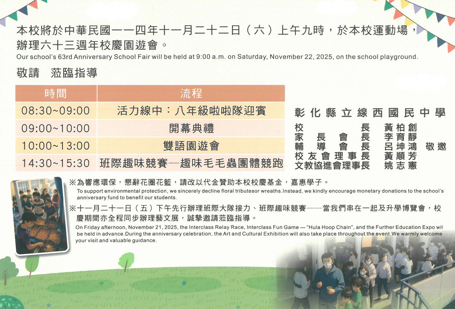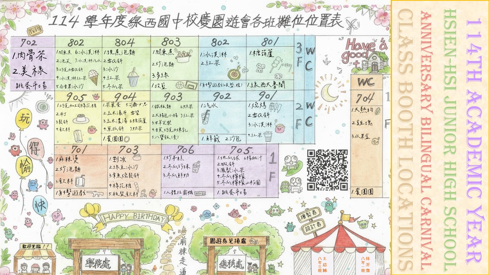 線西國中第63周年校慶雙語園遊會63rd Anniversary School Fair 114th Academic Year Hsien-hsi Junior High School Anniversary Bilingual Carnival 歡迎大家一起來學校熱鬧 Welcome everyone to join the fun at school!